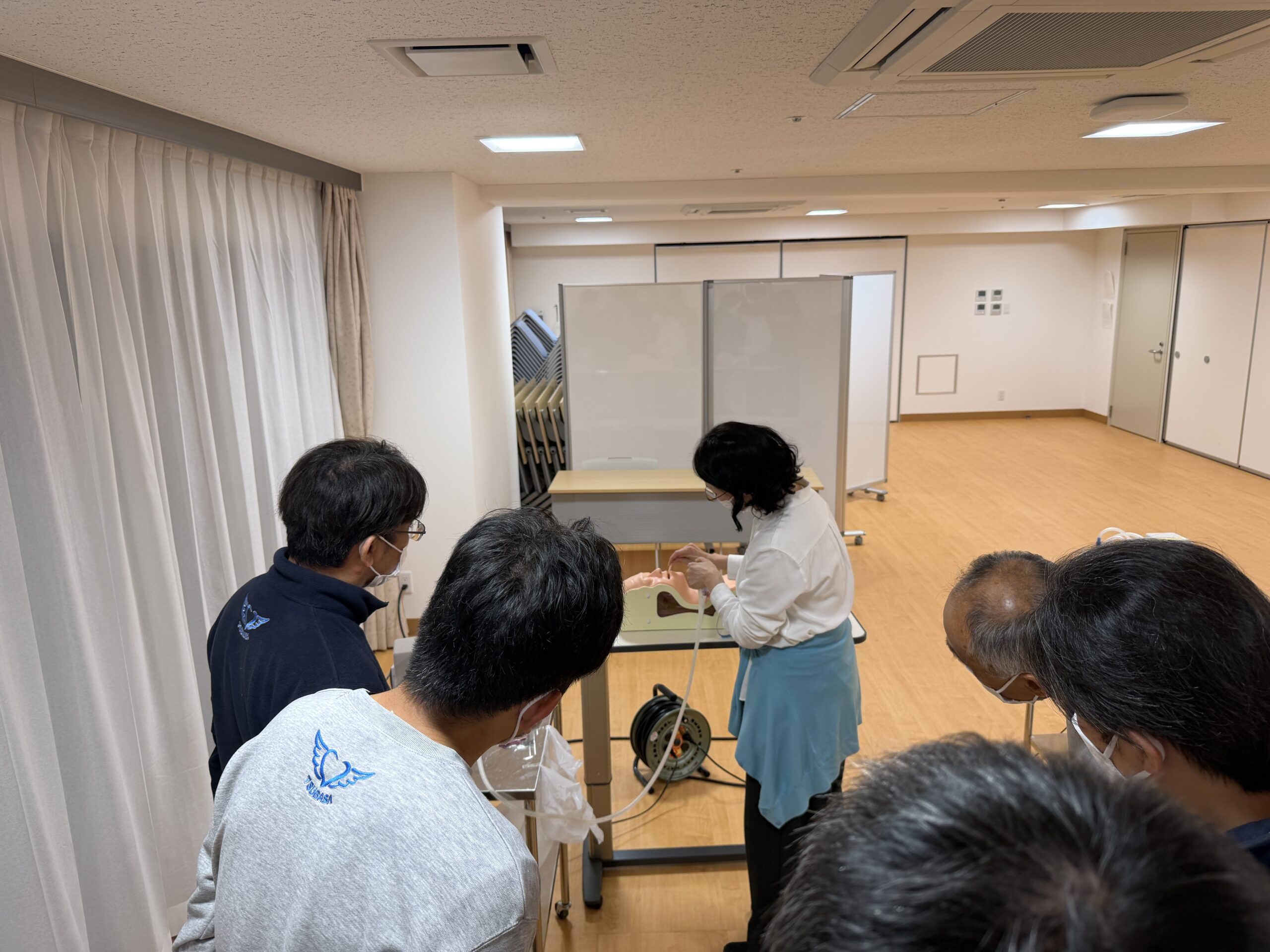先日、近隣施設のどんぐり山にて、当社のリハビリスタッフを対象に、重要な医療処置である「口腔・鼻腔内の喀痰吸引の手順」に関する勉強会を実施しました。